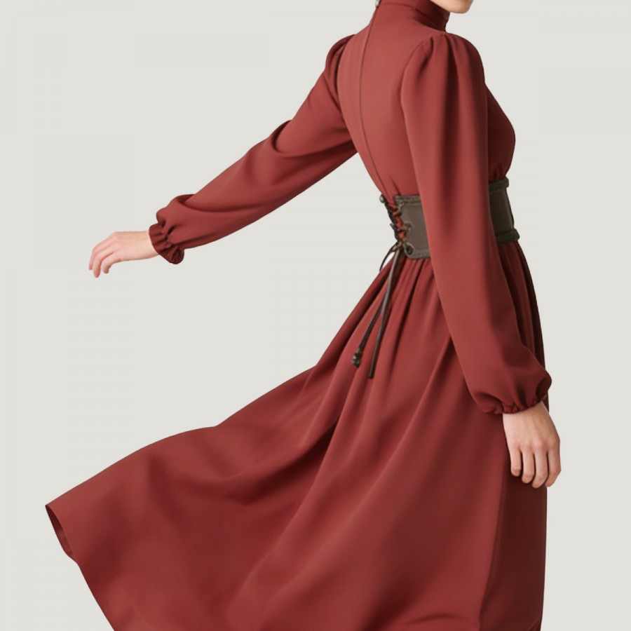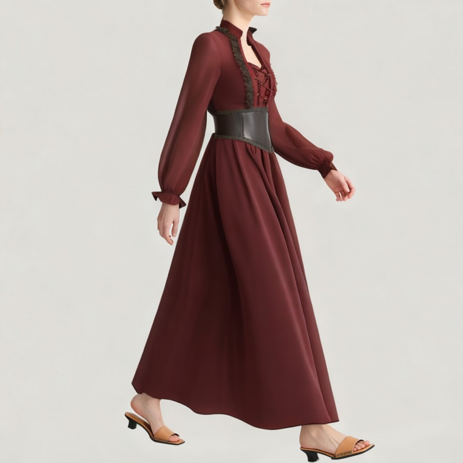 Deep red vintage hue with pleated details, presenting a classic Renaissance style