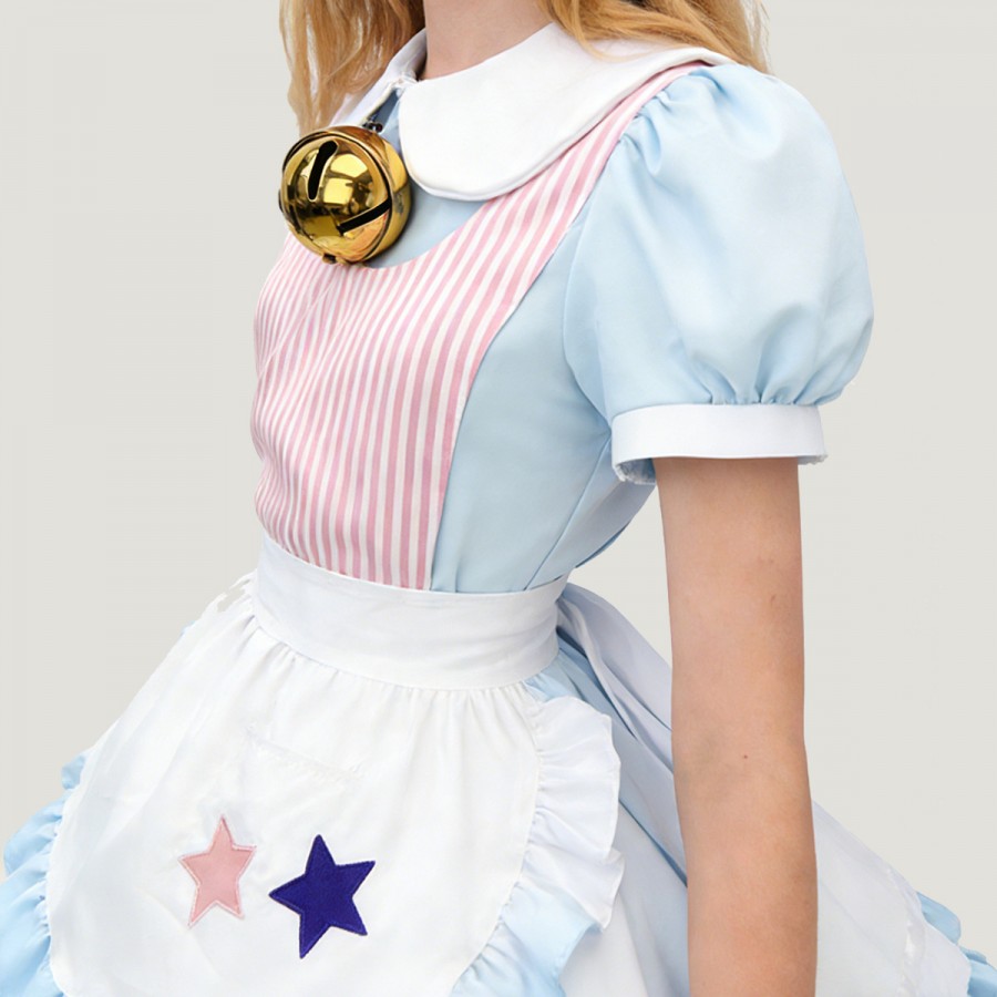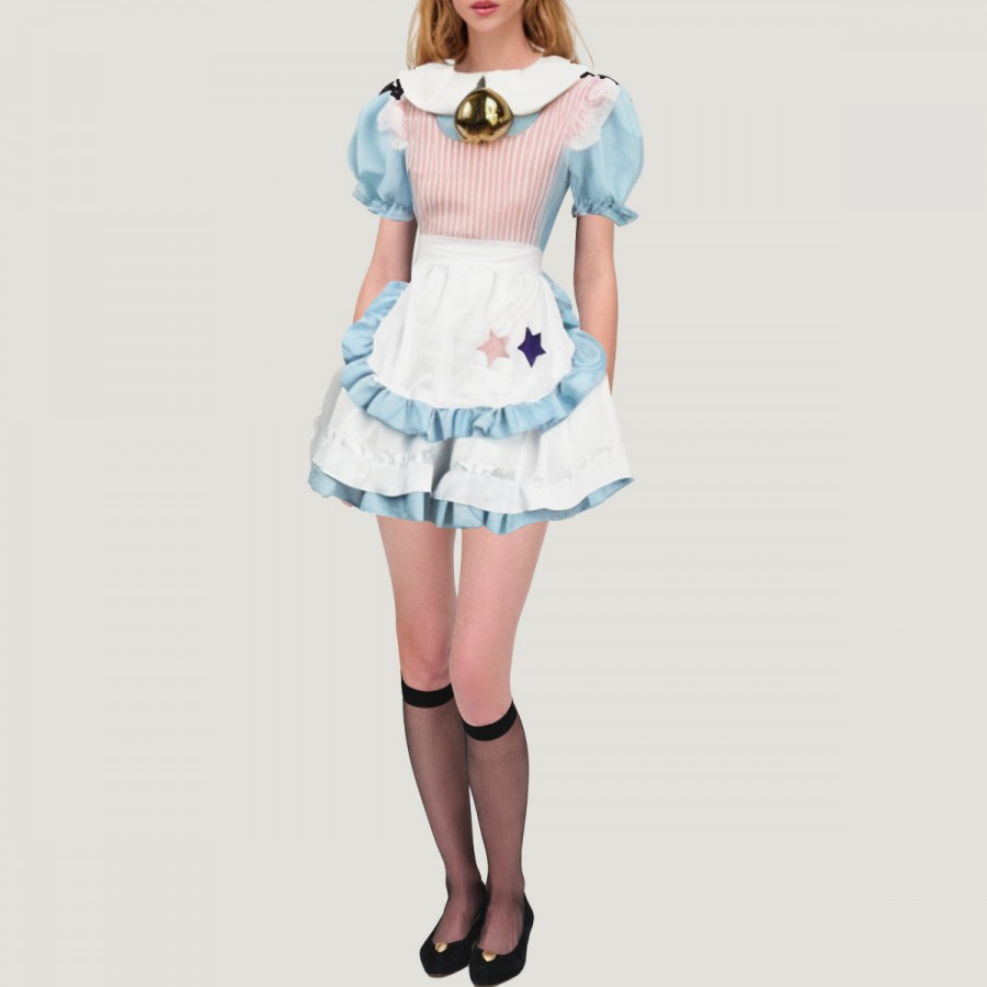 This outfit is inspired by Japanese anime maid characters, featuring a sweet and cute design with touches of sexiness, showcasing feminine elegance and playfulness. Made from high-quality polyester, the garment is lightweight, smooth, soft to the touch, durable, and wrinkle-resistant, making it suitable for extended wear. The skirt has a simple and elegant design, adorned with Lolita-style ruffles, adding depth and dimension to the overall look. The color scheme is a classic blue and white, and styles with or without bells are available to add a festive or stage-appropriate touch.
