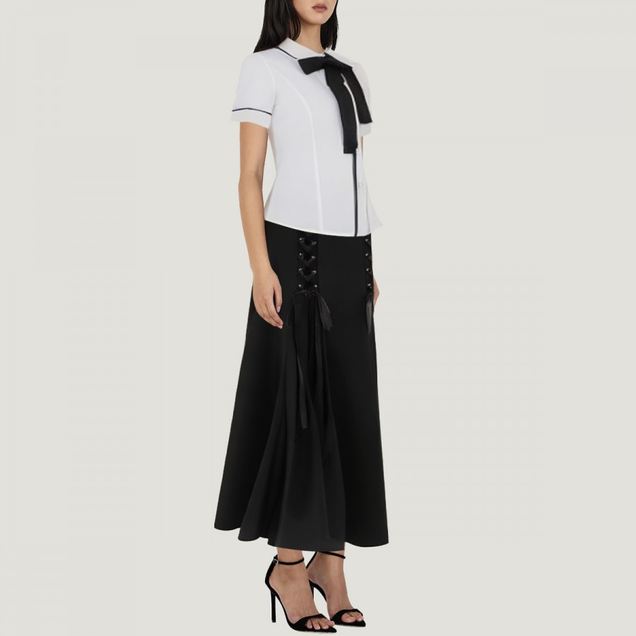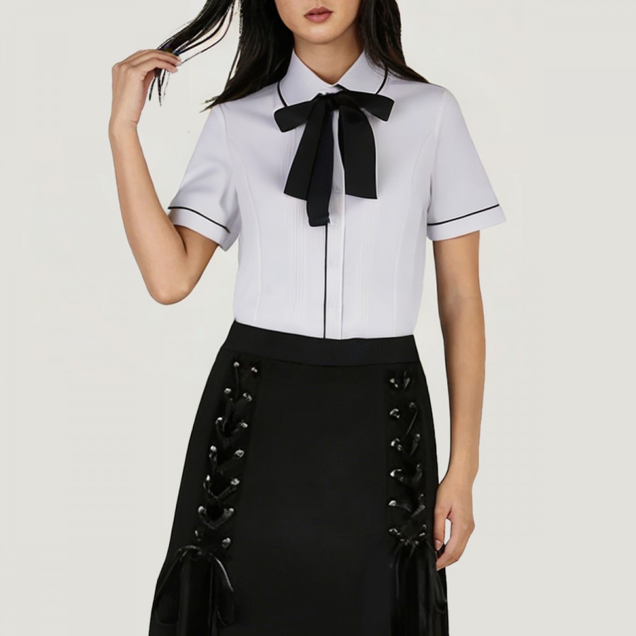 This shirt is made of 100% polyester chiffon fabric, which is soft and delicate to the touch and lightweight and flowing. The ivory white tone is fresh and elegant, with a naturally draping collar and a detachable black silk ribbon tie, creating a sweet yet versatile look. The button-down front makes it easy to put on and take off, and a spare button is included for thoughtful detail. The overall design is simple and clean, suitable for both a feminine style and casual business attire. Hand washing or gentle cleaning in cold water is recommended to maintain the garment's shape and texture.