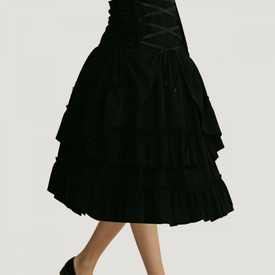 This dress is made of high-quality polyester, a lightweight and soft fabric that is comfortable to the touch and drapes beautifully. Inspired by medieval and steampunk styles, the dress features a fitted silhouette that accentuates the waistline, presenting an elegant and sophisticated Gothic aesthetic. The bodice has a form-fitting bustier design, while the hem is decorated with layered ruffles and delicate lace embellishments, adding a touch of vintage romance. The overall look combines elegance and drama, making it suitable for women who love Lolita or steampunk styles.