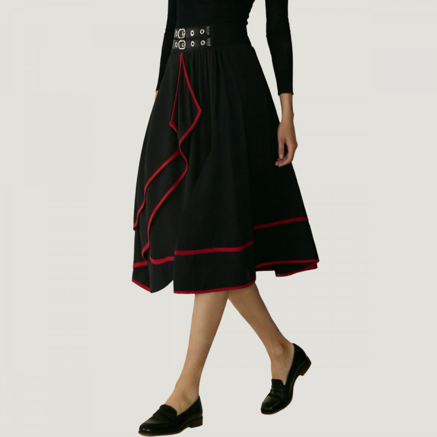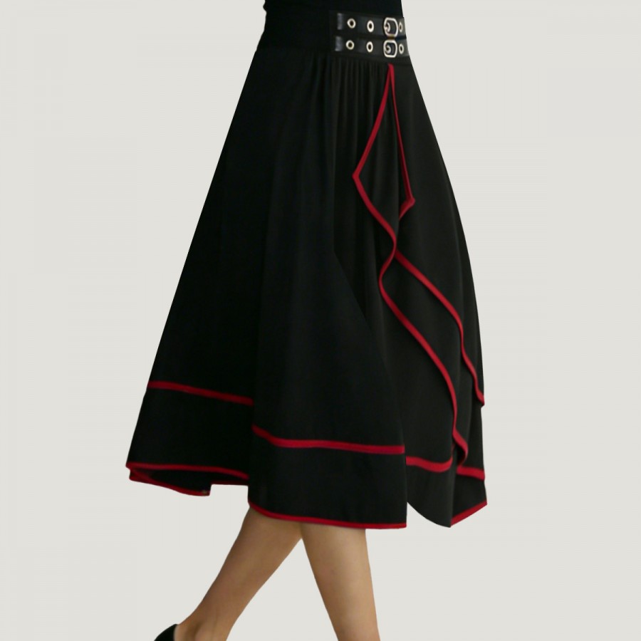 This skirt is made from premium polyester fabric, making it lightweight, durable, smooth to the touch, and with a beautiful drape. The high-waisted design with an elastic waistband ensures comfortable wear and flatters the figure. The A-line silhouette showcases elegant lines, while unique contrasting webbing buckle embellishments add a touch of gothic punk style, combining fashion with classic design. The mini to midi length makes it suitable for everyday wear or easily creates a cool look.