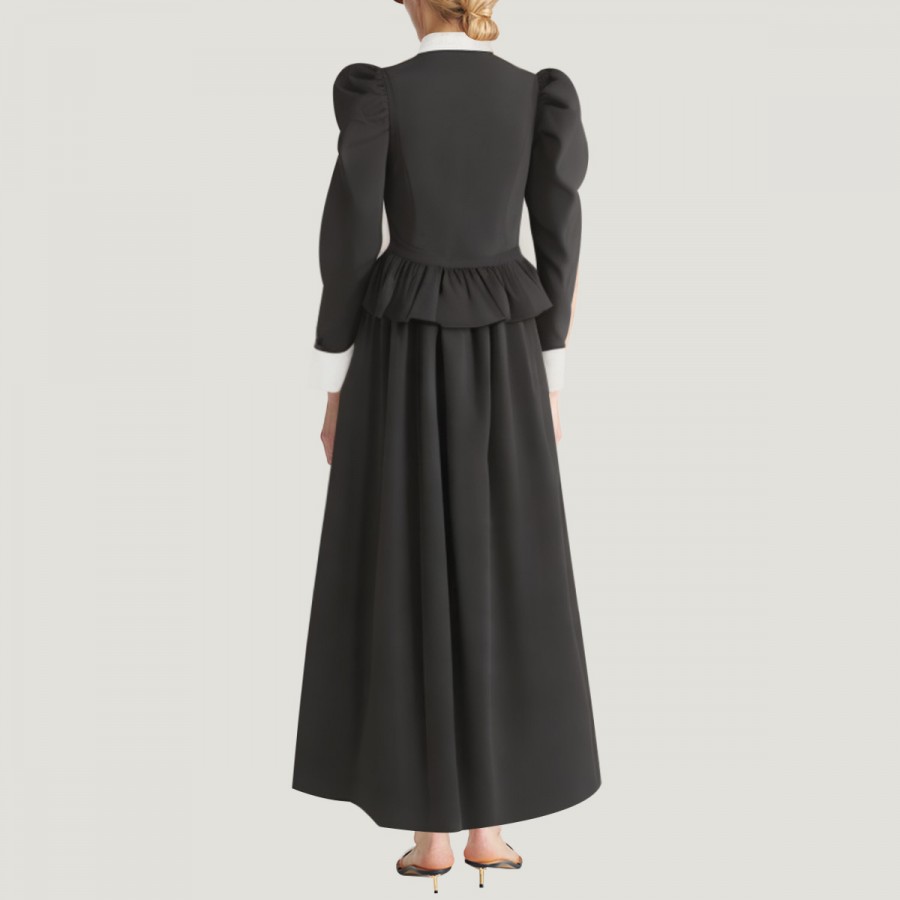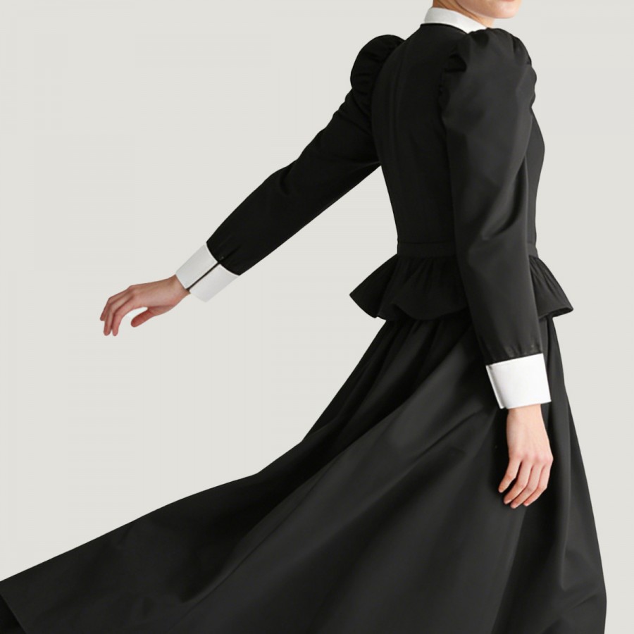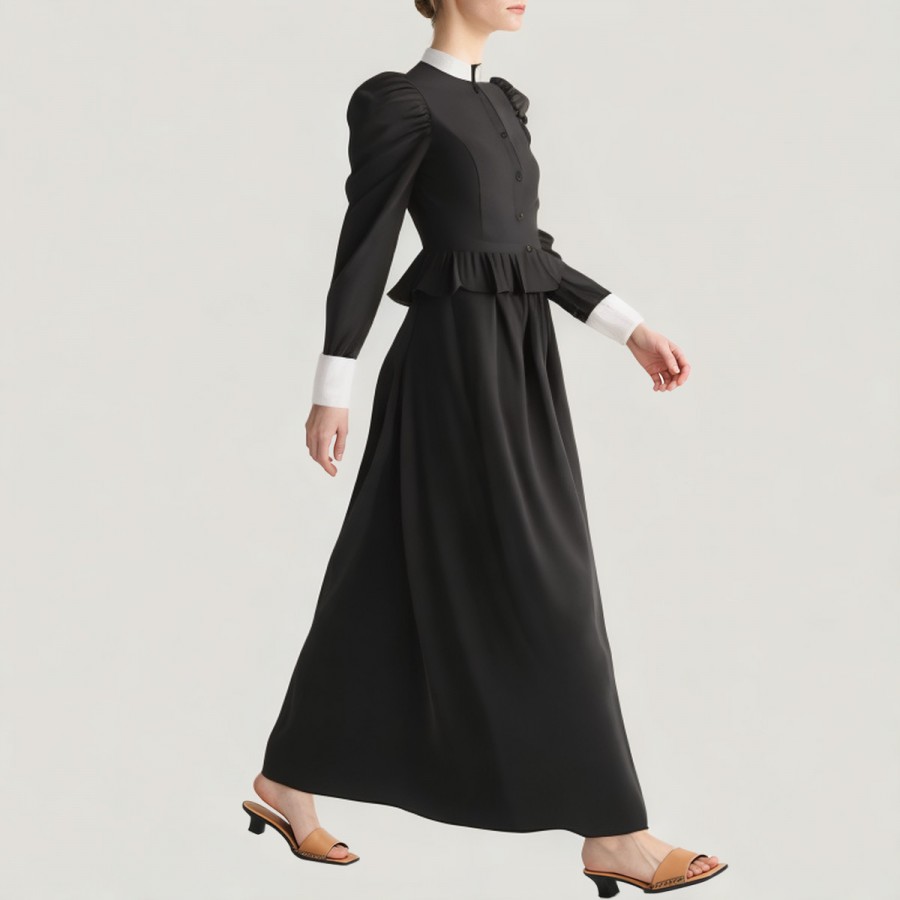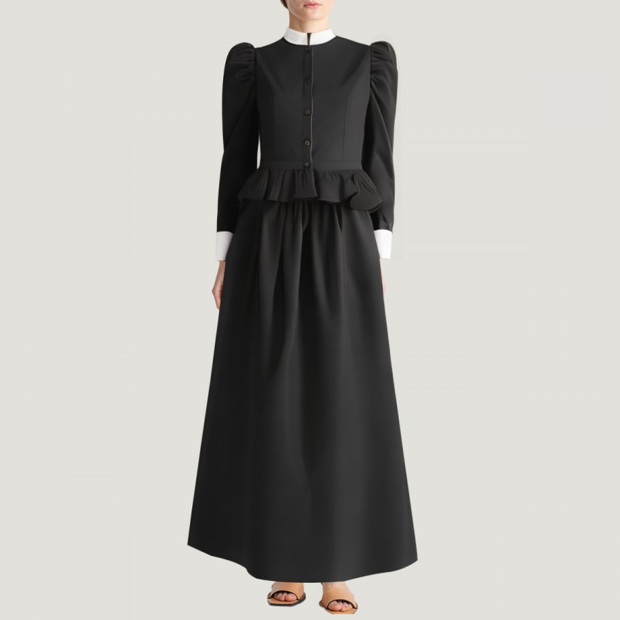 This dress perfectly recreates the Edwardian style of the 19th century, comprising a black button-down shirt and a classic black A-line skirt. The shirt features a turn-down collar, leg-of-mutton sleeves, and white cuff details, exuding elegant retro charm and showcasing the unique allure of Renaissance women. The A-line skirt accentuates the waistline and creates a natural, graceful silhouette. The entire outfit is made of high-quality polyester, which is soft, breathable, lightweight, wrinkle-resistant, easy to care for, and comfortable and durable.
