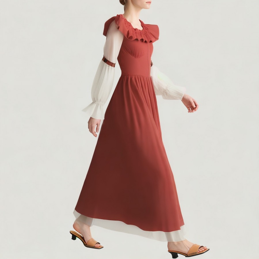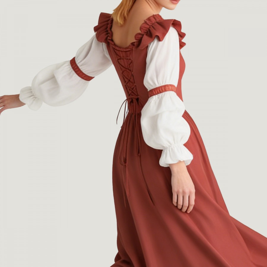 Inspired by traditional Oktoberfest attire in Munich, this dress features a classic high-waisted A-line design with a naturally flared skirt that exudes sweetness and playfulness. The top boasts a retro-inspired cinched waist, complemented by a lapel and ruffles for added sophistication. Made from high-quality polyester, it's soft, durable, lightweight, and breathable, allowing for all-day movement and dancing. The overall look retains a traditional festive feel while also being suitable for modern parties and performances.