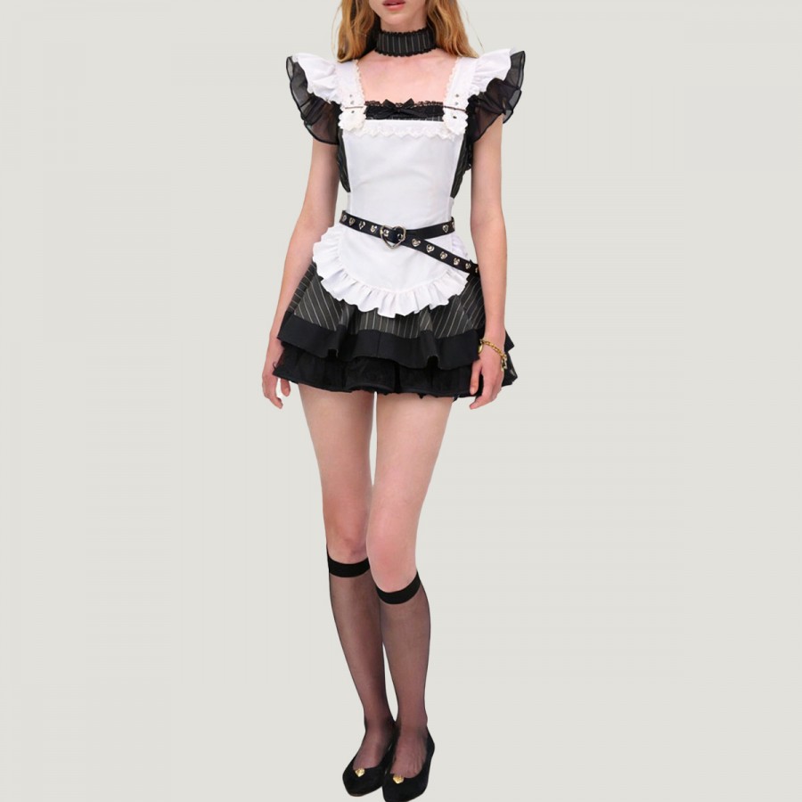 This outfit is inspired by retro black and white stripes, blending Japanese cuteness with subculture style for a sweet yet unique look. The garment is made from a blend of polyester and acrylic fibers, making it lightweight, soft, and elastic, durable and wrinkle-resistant. The color-weaving process ensures clear and distinct stripes. The set includes a dress, apron, and matching hat and belt, creating a complete and sophisticated look. The cinched waist accentuates the figure, while the layered ruffles at the hem add dimension and a Lolita-inspired feel.