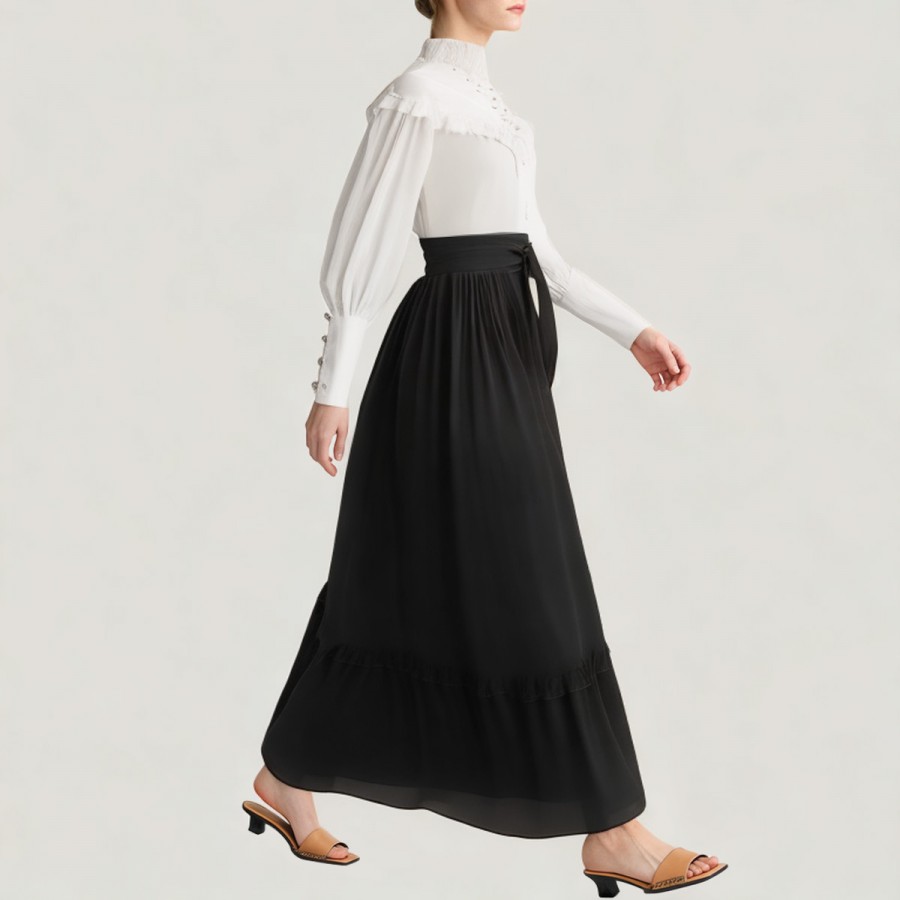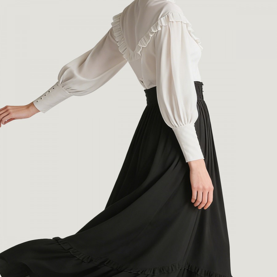 Pleated skirt hem, layered and flowing naturally.
