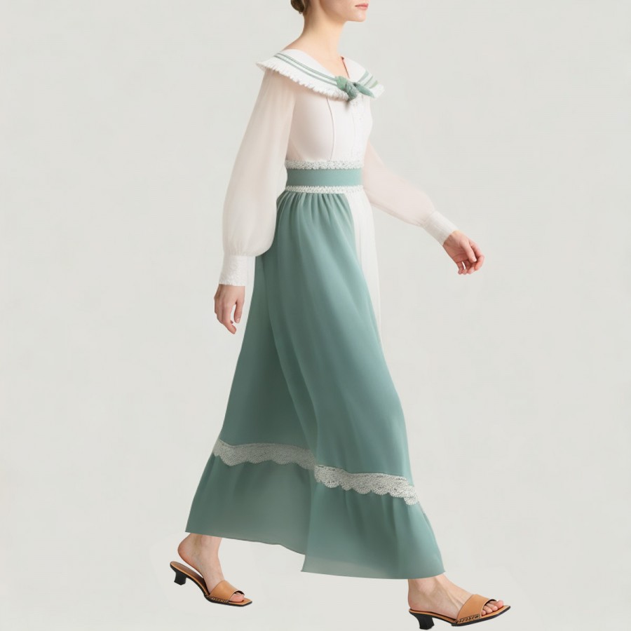This dress includes a white round-neck top and a white and green color-blocked skirt. The top is lined at the chest and slightly sheer elsewhere, adding elegance and sexiness. The skirt is made of satin snowflake fabric, decorated with white lace at the waist, and features a side zipper for easy on and off. The overall fabric is comfortable and breathable, suitable for low-temperature washing and hanging drying.