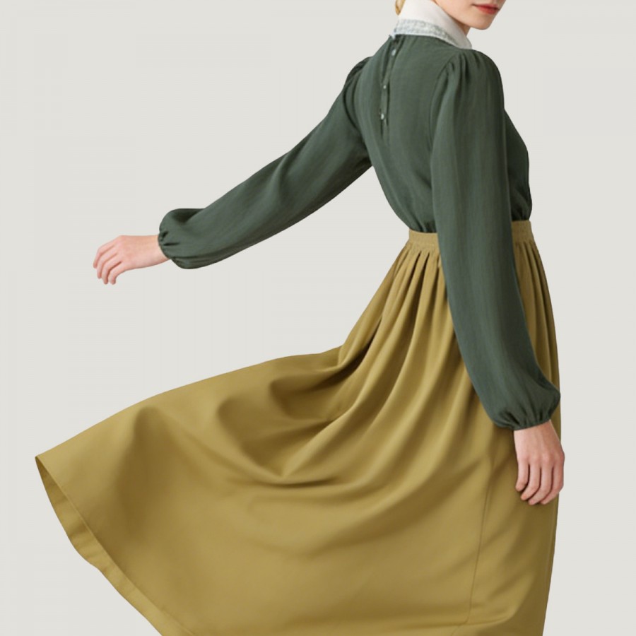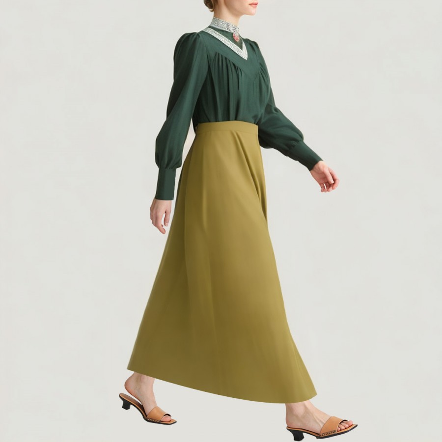 This set includes a dark green puff-sleeved blouse, a Renaissance-style skirt, and a pearl brooch. The overall look is vintage and elegant, easily suitable for commuting, afternoon tea parties, and retro-themed occasions. The blouse features a high neck, V-shaped lace ruffles, and puff sleeves that accentuate feminine curves. An elasticated back waist ensures a comfortable fit. The long skirt is made of high-quality polyester with a thick, draping hem and a high waist for an elegant silhouette. Lace details add a touch of vintage sophistication.