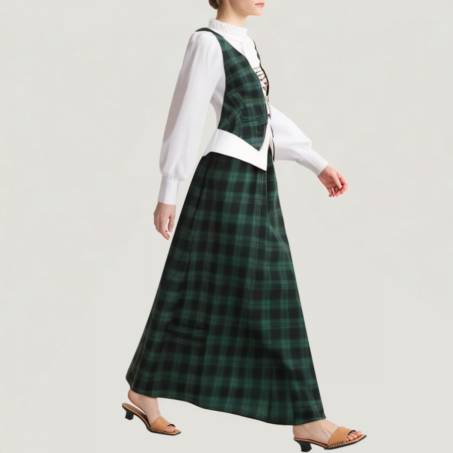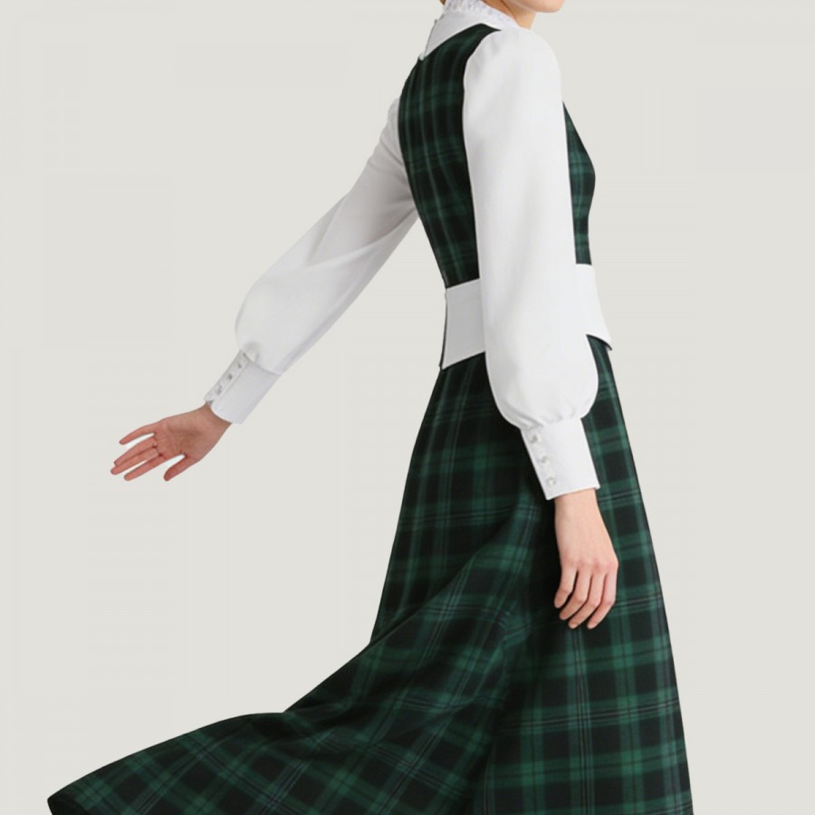 This dress perfectly captures the vintage charm of the Edwardian era in the 19th century. The set includes a white faux two-piece shirt and a green plaid skirt. The shirt features a ruffled collar, a bow, and a drawstring at the chest for a flattering silhouette; the skirt has a drawstring waist for easy adjustment and a naturally draped hem. Side pockets add both practicality and style. The shirt is made of polyester, and the skirt is crafted from a brushed plaid fabric, offering a soft and warm feel, perfect for autumn and winter wear. Slight fuzzing may occur after some use; this can be addressed with a lint remover.