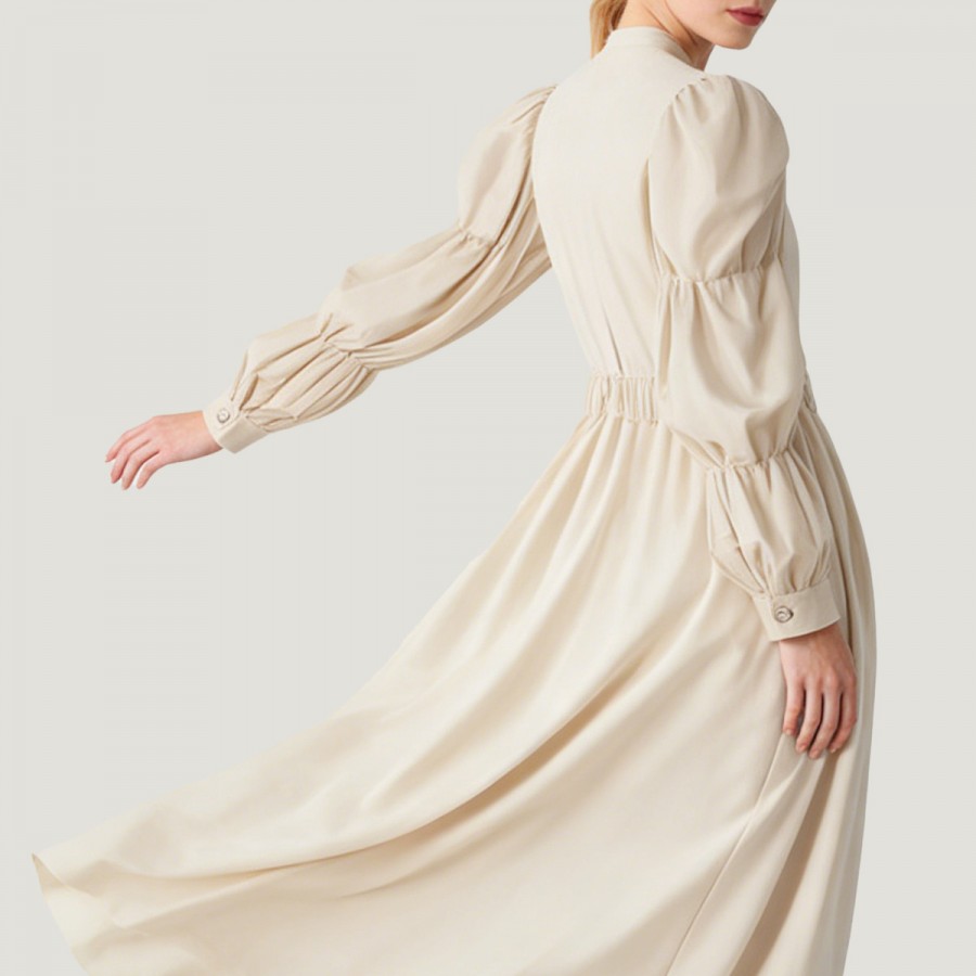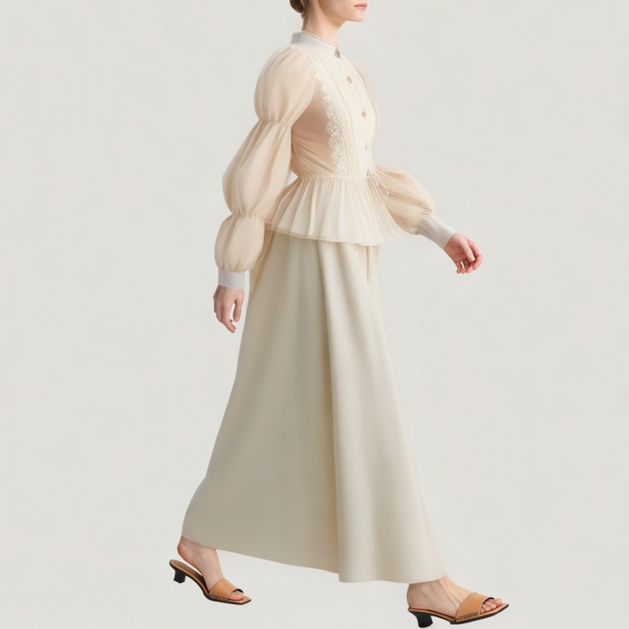 This dress blends classic Victorian and Edwardian designs, consisting of a stand-up collar lace blouse and an A-line maxi skirt. The blouse features delicate lace embellishments and buttons at the chest, elegant lantern sleeves, and a drawstring hem with ruffles for easy adjustment. The maxi skirt has a pleated waist and practical pockets on both sides, offering both convenience and style. This outfit combines vintage elegance with modern practicality, allowing for versatile styling options by pairing it with other pieces.