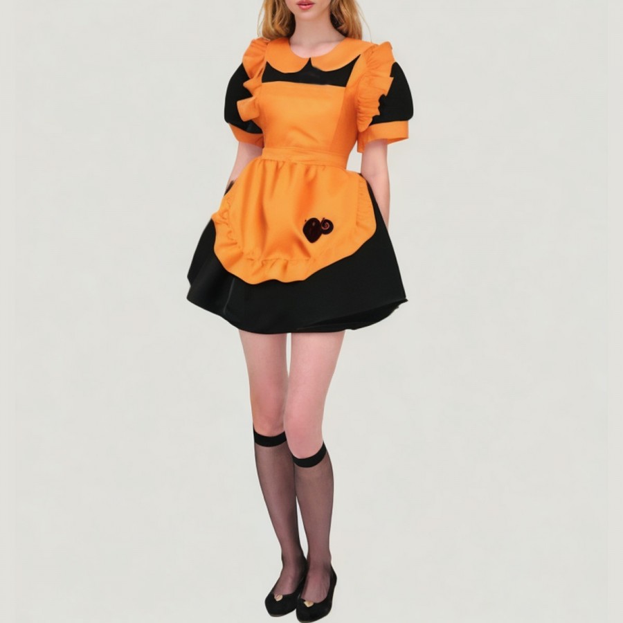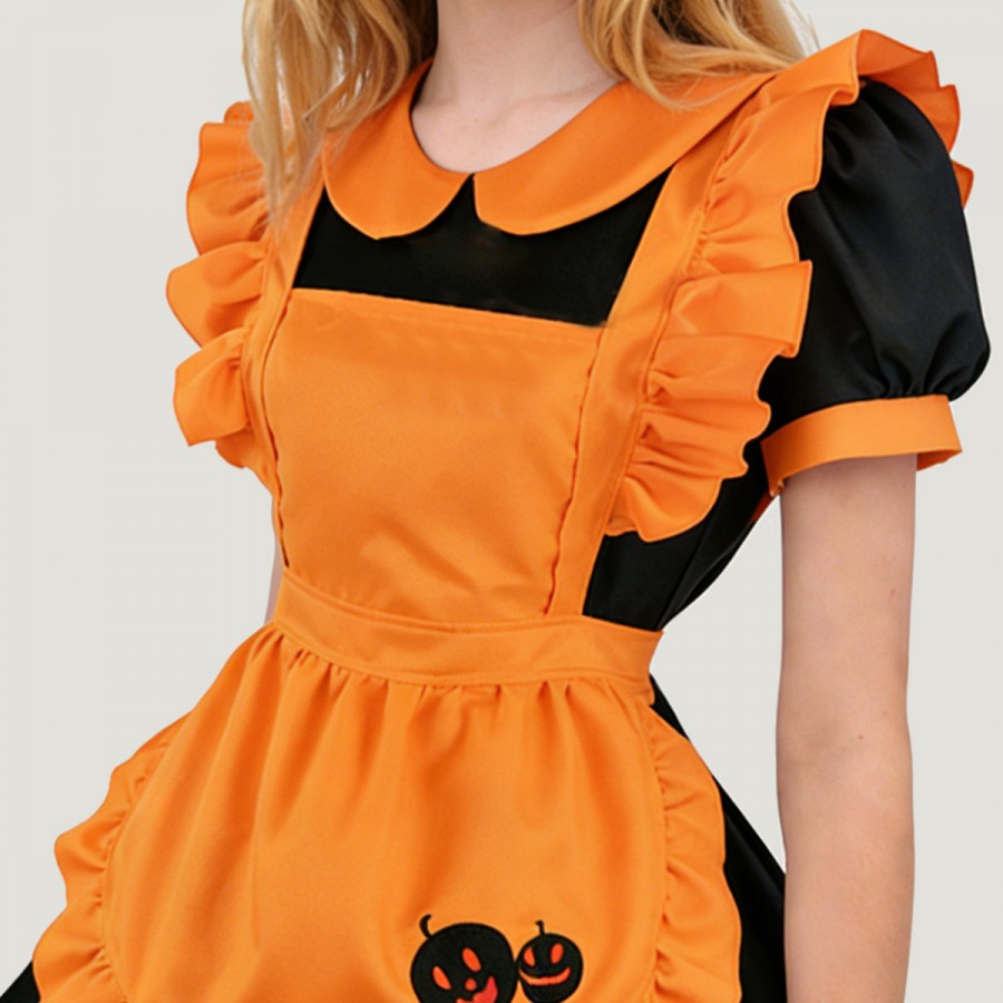 This outfit, inspired by a Halloween maid theme, blends pumpkin elements with Lolita sweetness, creating a look that is both playful and sexy. Made from high-quality polyester, it's lightweight, soft, durable, and wrinkle-resistant, suitable for extended wear or stage performances. The skirt features a layered design with classic maid uniform elements such as an apron and cute details, enhancing the character's recognizability and visual appeal. The outfit is well-coordinated and tailored, suitable for cosplay, holiday parties, or themed events.